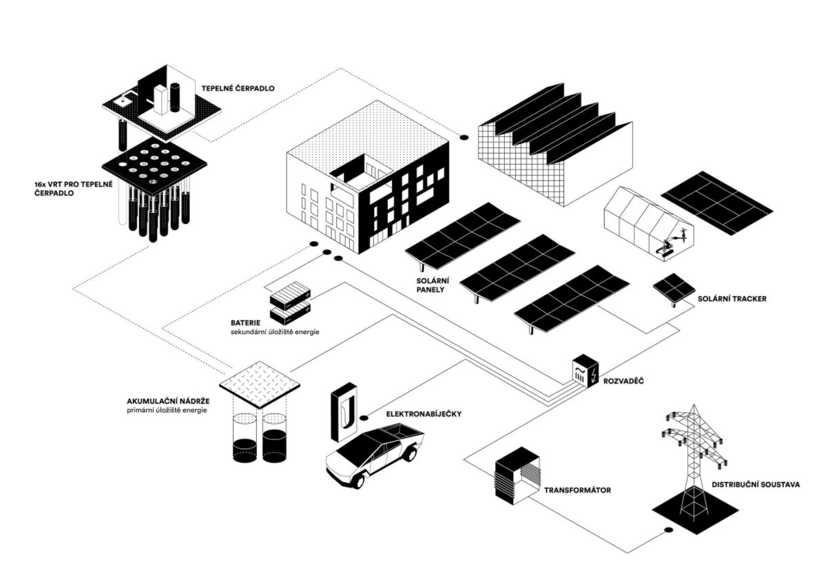 zařízení: tepelná čerpadla země voda vytápění+ohřev TV,řízené větrání s rekuperací, chlazení, fotovoltaické panely